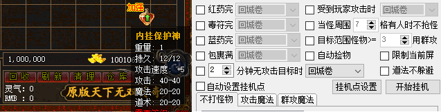 内挂保护神:速度加5,攻击和魔法,道术都将增加.只需要放在包裹就直接有效,不需要戴装备上.时刻保护着你